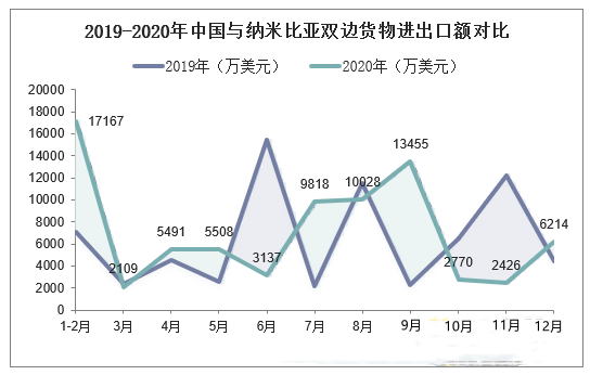 2019-2020年中国与纳米比亚双边货物进出口额对比